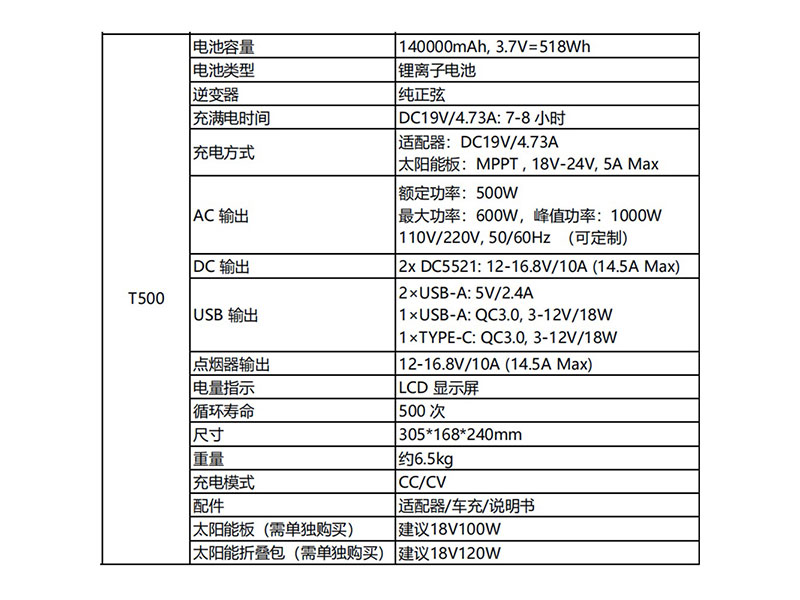 电池容量 140000mAh, 3.7V=518Wh